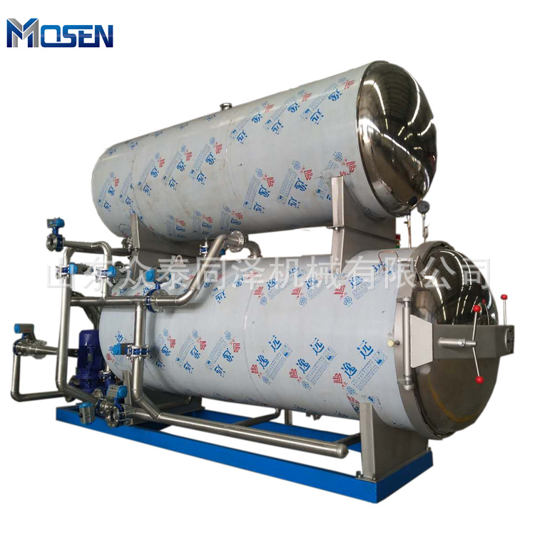1.水浴式杀菌锅由两个水箱组成,热水储存在顶部水箱中,并预设温度,软水经过循环利用,节省了蒸汽能量和水资源。