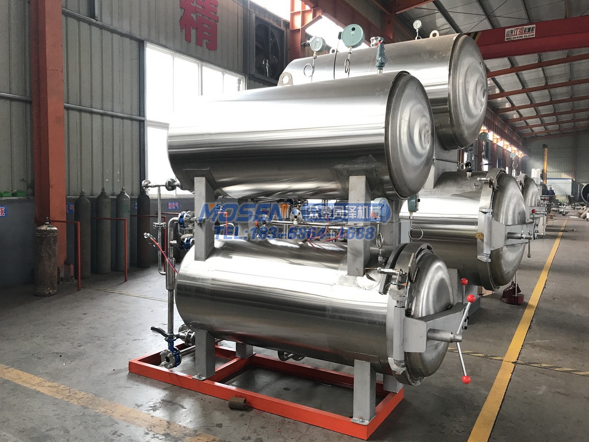 杀菌锅由锅体、锅盖、开启装置、锁紧楔块、安全联锁装置、轨道、灭菌筐、蒸汽喷管及若干管口等组成。锅盖密封采用充气式硅橡胶耐温密封圈,密封可靠,使用寿命长。以有一定的压力的蒸气为热源,具有受热面积大,热效率高、加热均匀、液料沸腾时间短、加热温度容易控制等特点。配有压力表和安全阀,外型美观、安装容易、操作方便、安全可靠。