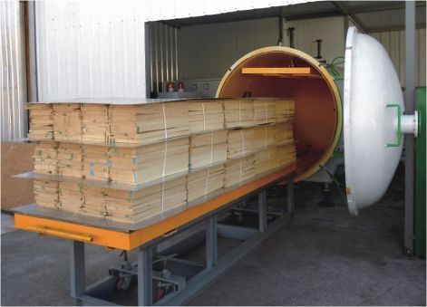 工作原理:采用真空、加压、加热等一系列工艺操作,并把一定浓度的防腐、阻燃、染色药液经过真空、高压、频压注入木材细胞内部从而起到防腐、防霉、防蛀、防白蚁及阻燃、染色等效果。